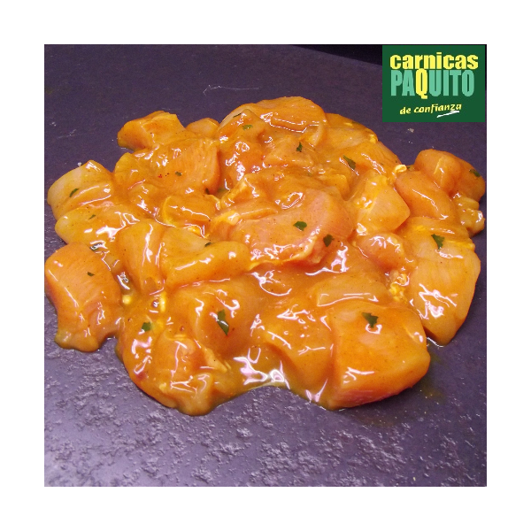 Pechuga de pollo, agua, sal, especias (cúrcuma, comino, ajo), mezcla de especias (dextrosa, conservadores E-262i) antioxidantes (E-331iii, E-301), mezcla de hierbas aromáticas, conservadores (E-325, E-262ii), sal común, comino, cayena, ajo,canela.
