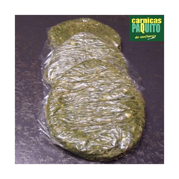 Escalope contramuslo pollo, espinacas, agua, espinacas, sal, fibras vegetales, especias, antioxidante E-331, conservante E-263, dextrosa, aroma, colorante E-120, conservador E-221, almidón, maíz, fibra de patata, corrector de acidez E-331i