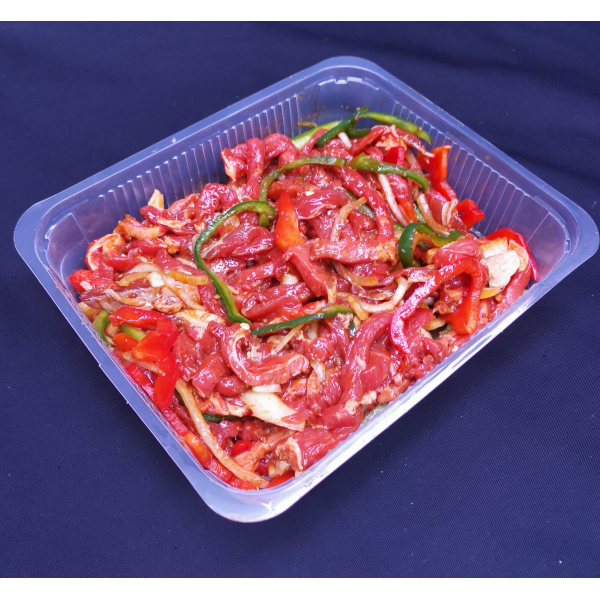 Filete de ternera, cebolla, pimiento rojo, pimiento verde, agua, azúcar moreno, SALSA DE SOJA (SEMILLA DE SOJA, harina de maíz, azúcar), aromas (colorante E-150a, maltodextrina), vinagre, sal, ajo, aceite vegetal (nabina), especias, colorante caramelo, corrector de acidez E-330, conservadores E-202 y E-211.