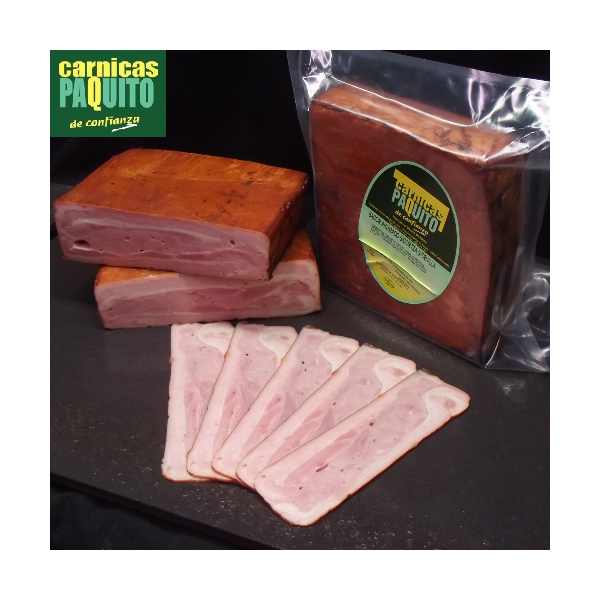 Panceta de cerdo (41.4%), papada de cerdo sin corteza (31.8%), agua, caramelo de SULFITO amónico E-150d y humo líquido, fécula de patata, sal común, dextrosa; E-407, E-451i, E-301,E-250, aceite esencial de pimienta negra, proteína de cerdo, sal común, E-407,E-120.