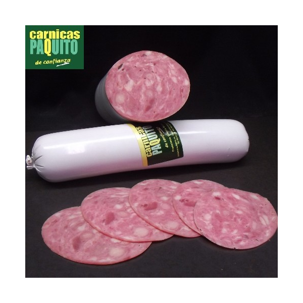 Carne de cerdo, Agua, sal, almidones de maíz y patata, especias, dextrosa, PROTEÍNA DE SOJA, E-451, E-452, E-621, E-301 y E-331, E-250, Brandy, agua destilada, E-120, nuez moscada, pimienta blanca, canela, ajo.