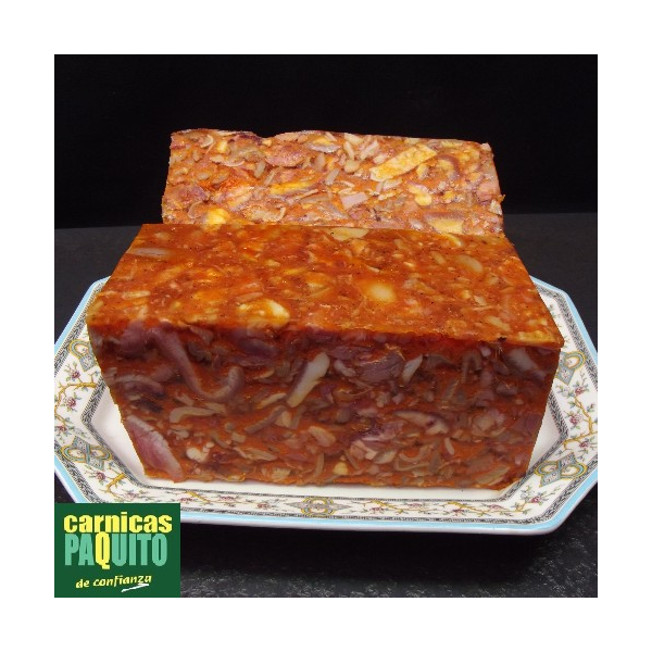 Carne cabeza cocida, cortezas de cerdo, cuajares, agua, cebolla cocida, VINO, pimiento rojo, sal, tomate mezclado con aceite de girasol, azúcar, almidón modificado de maíz, aroma de verduras; dextrina, gelatina, antioxidante, E-331iii, conservadores E-262i, E-325.