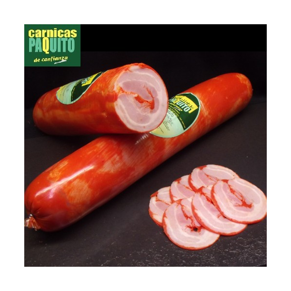 PANCETA DE CERDO, AGUA, FÉCULA DE PATATA, SAL, AZÚCAR, ESTABILIZADORES (E-451i, E-450iii y E-450v), PROTEÍNA DE SOJA, GELIFICANTES (E-407a, E-410 y E-415), AROMAS, CONSERVADOR (E-262i), ANTIOXIDANTES (E-316 y E-331iii), POTENCIADOR DEL SABOR (E-621), ANTIESPUMANTE (E-471), FÉCULA DE PATATA, SAL COMÚN, PIMENTÓN Y OLEORRESINA DE PIMENTÓN, DEXTROSA, AJO, SAL, CONSERVADOR (E-250), OLEORRESINA DE PIMENTÓN, COLORANTE (E-120).