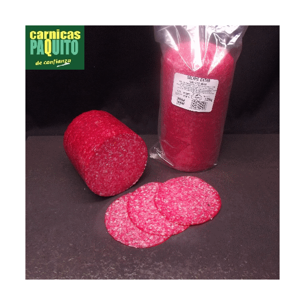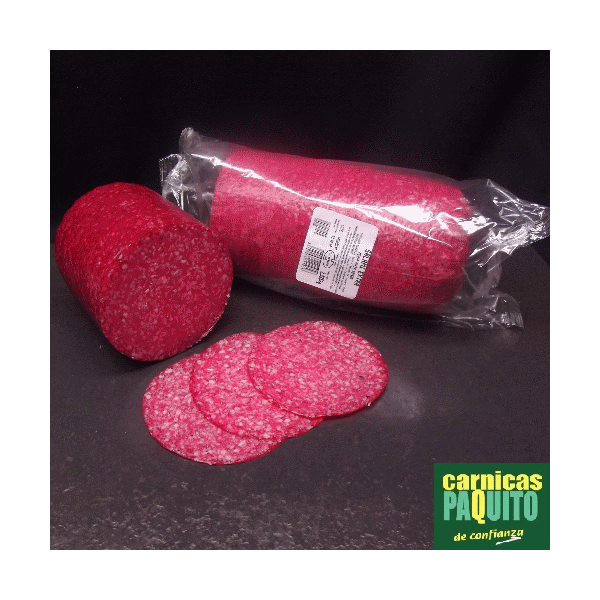 Carne y tocino de cerdo, leche en polvo,sal, azucar, especias, estabilizante E-4511, antioxidante E-301 conservadores E-250 y E-252 y colorante E-120 conservador de superfice E-202